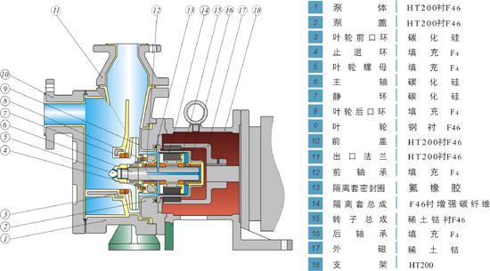 ZMD氟塑料磁力自吸泵其過流部件全部采用目前世界上耐腐蝕性能最優(yōu)秀“塑料王”(氟塑料)制造,泵體采用金屬外殼內(nèi)襯聚全氟乙丙烯(F46),泵蓋、葉輪均用金屬嵌件外包氟塑料整體燒結(jié)壓制而成 ,隔離套采用特殊材料制造,具有高強度的力學性能,消除了普通磁力泵存在的磁渦流現(xiàn)象。泵第一次使用前灌液后,第二次及以后使用則無需灌液,直接開機即可吸取輸送低于泵安裝位置以下的液體。自吸無泄漏的ZMD磁力泵是替代笨重液下泵進口自吸泵的理想選擇用泵。